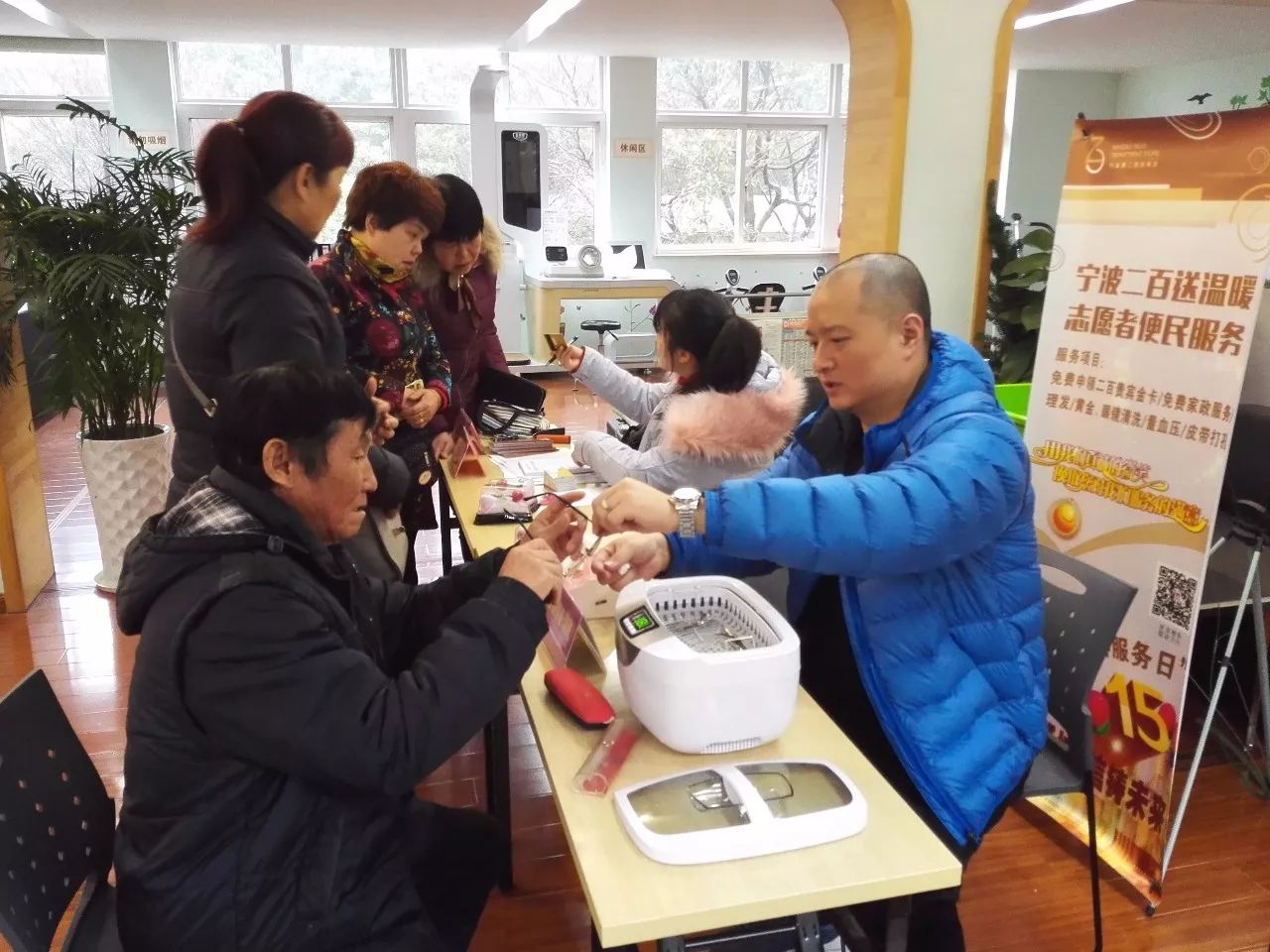 12月28日,一個陰雨綿綿的日子,冷空氣的到來,使甬城染上了絲絲涼意。這樣的日子里,寧波二百志愿者團(tuán)隊一大早便驅(qū)車趕往位于鐘公廟街道的鐘盈小區(qū)進(jìn)行便民服務(wù)。盡管天氣欠佳,但志愿者的熱情確絲毫未曾懈怠,到了小區(qū)服務(wù)點之后??粗蝗喝呵皝淼睦夏昃用?,二百志愿者們開啟了忙碌的“行程”。此次二百提供的便民項目主要有:黃金眼鏡清洗、皮帶打孔、血壓測量、義務(wù)理發(fā)以及貴賓卡免費申領(lǐng)。